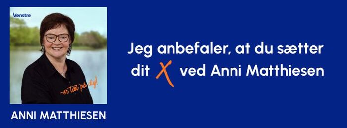 Husk at sætte kryds ved Anni Matthiesen på stemmesedlen. Din stemme er vigtig, så hun kan fortsætte det gode arbejde på Christiansborg.